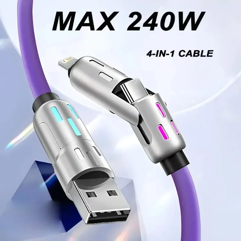 USB to Type-C 4 In 1 Multi Connectors Charger Rotating Elbow Mobile Phone 240W Fast Charging Silicone Cable Data Transfer